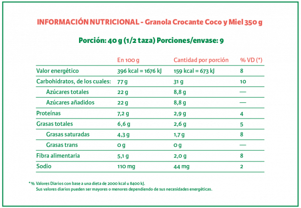 Ingredientes: avena arrollada, azúcar, crispines de arroz, jarabe de glucosa, copos de maíz, coco rallado, miel, aromatizante natural caramelo, antioxidante (tocoferoles).